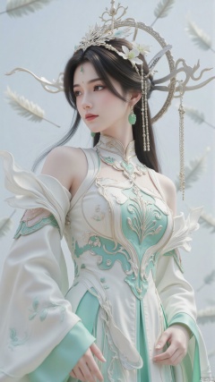(Best quality, 8K resolution, masterpiece, top quality, surreal style, high definition, dynamic 3D, 1 charming female, long hair dyed in mint green and pale pink gradient colors, complex jade earrings, floral themed headdress in silk texture, flowing white Hanfu with silver embroidered auspicious clouds, elegantly fluttered, a delicate and gentle yet determined face, fine embroidered details, a calm expression, floating seemingly glowing translucent feathers, creating a dreamy and extraordinary feeling, soft pastel palette, soft, diffuse light, an elegant and mysterious atmosphere focused on the girl, mint green and pale pink and white, foreground girl, mid-scene floating feathers)