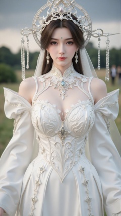 1girl, white wedding dress,looking at viewer, mischevious smile, perfect body, scenery, sharp focus, best quality, masterpiece, detailed outfit, illustration, perfect eyes, finely detailed beautiful anime eyes, realistic skin, intricate details, best lighting, depth of field, ultra high resolution, cowboy_shot, bride
