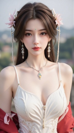 1girl,solo,jewelry,flower,hair flower,hair ornament,necklace,realistic,brown hair,brown eyes,looking at viewer,dress,blurry background,twin braids,blurry,white dress,long hair,upper body,breasts,pink bow,red jacket,bare shoulders,lips,collarbone,outdoors,cleavage,large natural breast,soft breasts,huge Breasts