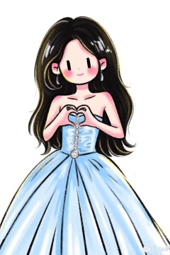 crayon (medium),The image depicts a young woman with long,dark hair,wearing a strapless,light blue dress adorned with a sparkling brooch at the center. She is smiling warmly,creating a heart shape with her hands. The background is plain white,emphasizing the subject and her attire.,