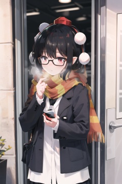 aya body,1girl,solo,shameimaru aya,winter_clothes,scarf,black-framed_eyewear,<lora:shameimaru aya nai005:0.7>,
