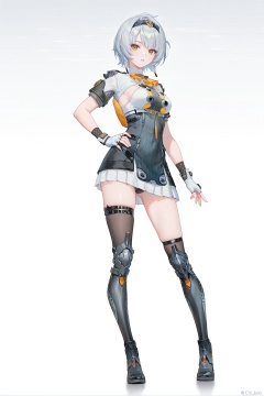 8k,best quality,masterpiece,(ultra-detailed),(high detailed skin),((artist:reoen),(artist:fuzichoco),(artist:atdan),(artist:torino_aqua),year 2024:0.8)1girl,[artist:wlop],[artist:ningen_mame],artist:ciloranko,[[artist:rhasta]],artist:tidsean,colorful,full body,full shot,standing,looking at viewer,(solo:1.2),simple background,(white background:1.2),hand on own hip,(white background:1.1),<lora:anbinew-ill-Tanger-000013:1>,anby demara \(silver soldier\),clothes: silver soldier black and white short dress,silver soldier clothes,1girl,black knee boots,fingerless gloves,hairband,