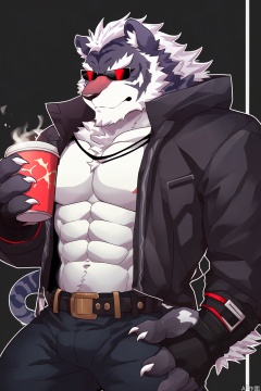 solo, short hair, 1boy, navel, holding,red eyes,animal ears, nipples, jacket, tail, white hair, male focus, open clothes, alternate costume, belt, pants, fingerless gloves, stomach, open jacket, cup, muscular, feet out of frame, abs, sunglasses, pectorals, muscular male, holding cup, bara, furry, large pectorals, furry male, tiger ears, disposable cup, bare pectorals, white and black fur, tiger boy,character:PangSP