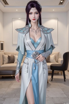 She was wearing a long robe. The upper part is mainly silver white in color and made of silk material. The inner lining is light blue, forming a soft and layered combination with the outer white. The shoulders are equipped with exaggerated silver shoulder guards, carved with complex and exquisite patterns that seem to be symbols from an ancient and mysterious world, showcasing a sense of power while maintaining exquisite beauty.