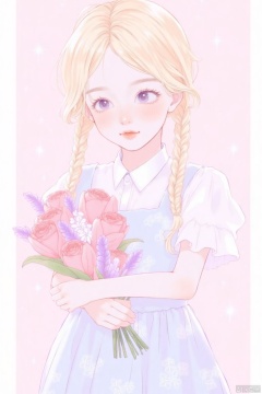 The image depicts a young girl with light blonde hair styled in two braids, holding a bouquet of flowers. The flowers include pink roses and small white blossoms, along with lavender stems. She is wearing a light blue dress with a floral pattern. The background is a soft pastel color, with small flowers and stars scattered around, giving a whimsical and dreamy atmosphere. The overall style is reminiscent of a soft, anime-inspired illustration.