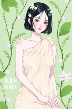 The image depicts a stylized illustration of a woman with short black hair adorned with white flowers. She is dressed in a light-colored garment that appears to be made of fabric with a fan-like design. Surrounding her are green leaves and branches, creating a natural, almost forest-like setting. The background is a soft, muted green, complementing the overall serene and nature-inspired theme. The text in the image reads "ALAIN" and "JENNIE" in the bottom left corner, suggesting the artist's names.