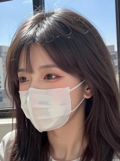 WHTX, A close-up photograph of a woman with long, straight brown hair, wearing a white face mask covering her nose and mouth. She has bangs and is looking slightly off to the side. The lighting is bright and natural, coming from the left side of the frame. Behind her, there is a large window with a view of a cityscape with buildings and a clear blue sky. The woman is wearing a light-colored top, and the overall atmosphere is bright and sunny.