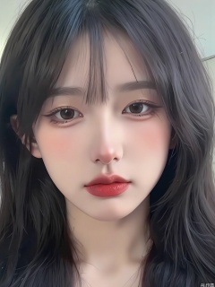 WHTX, Close-up photograph of a young woman with long, straight black hair and bangs. She has fair skin and is wearing bold, red lipstick. Her eyes are accentuated with dramatic, winged eyeliner. The lighting is soft and natural, highlighting her face. She has a neutral expression with slightly parted lips. The background is out of focus and light-colored, creating a gentle contrast with her features. The overall aesthetic is modern and minimalistic, focusing on her striking makeup and natural beauty.