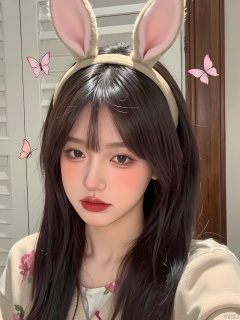 WHTX, Photo of a young woman with long, straight brown hair and bangs, wearing a beige headband with a cat ear design, and a beige cardigan with a floral pattern. She has a neutral expression, red lipstick, and light makeup with subtle eyeshadow. The background is a white wooden shutter door with a wooden trim. The image has a playful, cute aesthetic with cartoon-style butterflies added to the photo, giving it a whimsical touch.