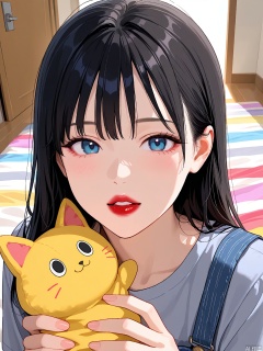 WHTX, A photograph of a young woman with long, straight black hair, wearing a grey top. She is holding a plush toy resembling a cat, with a white body and blue stripes, close to her face. Her expression is neutral, with slightly parted lips and red lipstick. The background shows a bed with colorful sheets and a wall with a door. The lighting is soft and natural, coming from the left side of the image. The overall tone is casual and intimate.