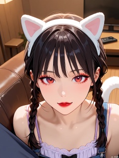 WHTX, Close-up photograph of a young woman with fair skin, wearing a purple bra, and a white cat ear headband with a black bow. She has long, dark hair styled in two braids, and is looking directly at the camera with a neutral expression. Her makeup includes soft eyeshadow and red lipstick. The background is a simple indoor setting with a wooden table and chairs, and a couch. The lighting is soft and natural, coming from the left side. The overall aesthetic is casual and relaxed.