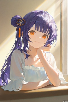 solo,orange eyes,hair ornament,bangs,purple hair,long hair,smile,single_hair_bun,front view,bust,,Side ponytail,blunt bangs,blouse,dress