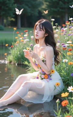 The image shows a young woman sitting on the edge of a pond surrounded by a field of colorful flowers. She is wearing a white dress with a floral pattern and has long dark hair. The woman is holding a small bouquet of flowers in her hand and is looking off into the distance with a peaceful expression on her face. The pond is filled with water and there are several butterflies fluttering around her. The background is blurred, but it appears to be a garden or park with trees and greenery. The overall mood of the image is serene and peaceful.
