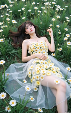 The image shows a young woman lying in a field of daisies. She is wearing a white dress with a flowy skirt that is covered in yellow and white flowers. The dress is strapless and has a sweetheart neckline. The woman has long dark hair that is styled in loose waves and is resting her head on her hands. She has a peaceful expression on her face and is looking up at the sky. The field is filled with tall, white flowers that are scattered all over the ground. The overall mood of the image is serene and dreamy.
