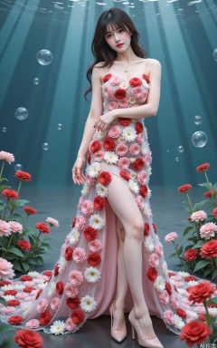 The image shows a young woman standing in a field of pink and red flowers. She is wearing a long, flowing gown with a sweetheart neckline and a high slit on the side. The gown is made up of multiple layers of flowers in different shades of pink, red, and white, creating a beautiful and intricate design. The woman is posing with one hand on her hip and the other resting on her thigh. She has long dark hair styled in loose waves and is wearing high heels. The background is a deep blue ocean with bubbles floating around her. The overall mood of the image is dreamy and romantic.