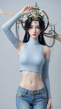She raised one hand high and touched the headpiece on her head with the other, showcasing her beauty and the delicacy of the headpiece. Use a simple light gray background.