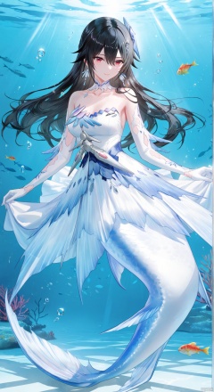 1girl, solo,lucia(PGR), long hair, breasts,bangs, black hair, hair ornament, red eyes, soft gentle eyes,gentle expression,light smile,dress, hair between eyes, bare shoulders, jewelry, collarbone, earrings, indoors, white gloves, white dress, monster girl, fish, bubble, underwater, air bubble, mermaid,depth of field, light particles, lens flare, masterpiece,best quality,((artist:reoen),(artist:fuzichoco),(artist:atdan),(artist:torino_aqua:0.5),year 2024:0.5),(artist:omone_hokoma_agm:0.8), 2d, anime,