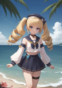 score_10,score_9,score_8_up,score_7_up,1girl,beach,solo,blue eyes,swimsuit,outdoors,blonde hair,hat,detached sleeves,ocean,looking at viewer,twintails,drill hair,choker,day,blurry,blue sky,sailor collar,long hair,sailor hat,sky,twin drills,blurry background,long sleeves,skirt,standing,thigh strap,flower,bow,water,sidelocks,looking_at_viewer,eye-contact,