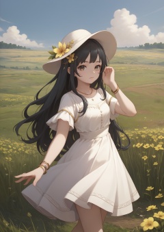 score_10,score_9,score_8_up,score_7_up,1girl,solo,long hair,black hair,field,flower,hair ornament,outdoors,white skirt,skirt,yellow flower,jewelry,hat,bracelet,dress,looking_at_viewer,eye-contact,