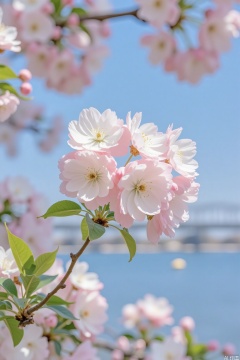 Cherry blossoms,background,no humens, A cherry blossom branch with white and pink flowers, featuring pure petals and golden stamens, accented by fresh green leaves. The background includes a clear blue sky and blurred outlines of distant cherry trees, with bright sunlight enhancing the vitality of the scene.