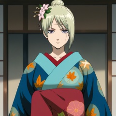 masterpiece, best quality, Tsukuyo,Gintama_anime_style, blonde_hair,purple eyes,scar,ninja,scar on forehead,scar on face, folded ponytail, kiseru, scar on cheek,hair bun,bangs,pattern on kimono,wide sleeves,hakama skirt, leaf print, print kimono, long sleeves, collarbone, floral print, jewelry, hair flower, earrings, sash,kimono,japanese clothes,hair stick,hair_ornament,blue_kimono<lora:月咏-死神太夫-ill:0.8>