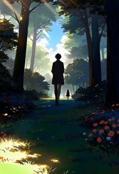 1girl, 1boy, \n\ndetailed background, shade, shadow, darkness, sketch, scratch art, forest, fading, scenery, very vibrant colors, amazing quality, tree, dress, fantasy, flower, cloud, sky, letterboxed, grass, light rays, day, cloudy sky, nature, backlighting, from behind, blue sky, short hair, outdoors, sunlight, facing away, leaf, sunbeam, walking away, black hair, silhouette,\nbest quality, very aesthetic, masterpiece, absurdres, general, artist:yd_{orange_maru} , mikumikudance, ingame render , pixelated, pixiv, rella