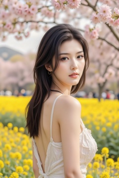 a sexy woman gazes into the distance. With long, straight black hair and a languid, mysterious look in her eyes, her fair and radiant skin stands out. Cherry blossoms form a cloud-like canopy, and as the breeze passes, petals gently drift down, creating a serene and enchanting atmosphere. Soft natural light bathes her, with distinct light and shadow layers that accentuate her contours. The photo is taken with a Fujifilm X-T4, aperture f/3.5, shutter speed 1/125 second, ISO 100. The overall tone is dominated by light pink and beige, evoking a fresh and elegant style. A slight soft light effect is added to enhance the gentle beauty of the scene.Cherry blossoms,background,no humens, outdoors, Golden rapeseed flowers and pink cherry blossoms complement each other, creating a colorful scene. The rapeseed flowers form a dense golden sea, while cherry blossoms on the trees have layered petals that fall like pink snowflakes. In the distance, there are green hills, adding vitality to the scene.