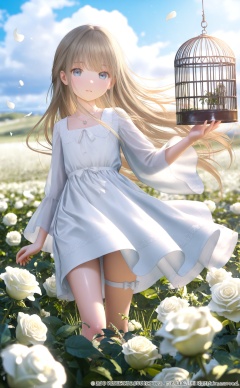 masterpiece,best quality,high quality,loli,chromatic_aberration,Light Blue Theme,//,loli,1girl,solo,long hair,birdcage,dress,flower,blue eyes,white flower,white dress,cage,sky,holding,looking at viewer,outdoors,very long hair,brown hair,cloud,petals,floating hair,day,jewelry,falling petals,blue sky,field,blonde hair,flower field,bow,closed mouth,necklace,white rose,wide sleeves,thigh strap,parted lips,wind,//,//,official art,depth of field,detailed light,blurry background,cinematic lighting,ray tracing,amazing quality,very aesthetic,absurdres,beast quality,ultra detailed,god rays,backlighting,photo background,film grain,chromatic aberration,volumetric lighting,depth of field,blurry background,shiny skin,floating hair,cinematic lighting,day,very aesthetic,