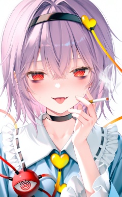 masterpiece,very aware,highres,absurdres,newest,best quality,high quality,loli,petite,chromatic_aberration,Light Blue Theme,//,1girl, @_@, komeiji satori, cigarette, solo, red eyes, third eye, tongue, holding cigarette, holding, shirt, white background, hairband, open mouth, blue shirt, upper body, simple background, smoke, heart, tongue out, smoking, long sleeves, short hair, black hairband, purple hair, heart hair ornament, frilled shirt collar, wide sleeves, frills, hair between eyes, frilled sleeves, hair ornament, looking at viewer, choker, ringed eyes, heart button, buttons, black choker, fang, smile, ribbon trim, eyeball, sweat, blush, bags under eyes, blouse, breasts, collared shirt//,(artist:chen bin:1.1),(quasarcake:0.2),(rurudo:0.9),(honjou raita,lack,rella,wanke:0.3),(nakamura_regura:0.4),(yoneyama mai:0.3),//,
