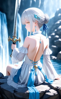 masterpiece,very aware,highres,absurdres,newest,best quality,high quality,loli,petite,chromatic_aberration,Light Blue Theme,//,1girl,solo,weapon,sword,dress,holding,hair ornament,yellow eyes,holding weapon,sitting,white dress,bare shoulders,earrings,holding sword,waterfall,white hair,jewelry,backless outfit,bare back,breasts,from behind,detached collar,detached sleeves,off shoulder,grey hair,rock,hair bun,off-shoulder dress,wide sleeves,back,backless dress,sidelocks,tassel,closed mouth,medium breasts,back focus,makeup,long sleeves,blue ribbon,shoulder blades,looking back,cave,//,//,official art,depth of field,detailed light,blurry background,best shadow,shiny skin,cinematic lighting,ray tracing,amazing quality,very aesthetic,absurdres,beast quality,ultra detailed,newest,8K,HDR,