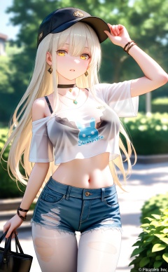masterpiece,very aware,highres,absurdres,newest,best quality,high quality,loli,petite,chromatic_aberration,Light Blue Theme,lens_flare,//,jewelry,1girl,denim,denim shorts,shorts,solo,cutoffs,long hair,shirt,navel,earrings,pantyhose,choker,blurry,bra,black bra,hat,midriff,torn clothes,blurry background,baseball cap,crop top overhang,outdoors,looking at viewer,parted lips,crop top,breasts,underwear,black choker,white shirt,short shorts,off shoulder,off-shoulder shirt,necklace,torn pantyhose,black headwear,cowboy shot,bracelet,depth of field,blue shorts,holding,torn shorts,bag,arm up,day,blonde hair,stomach,hand on headwear,yellow eyes,cropped shirt,lace trim,hair between eyes,white pantyhose,bra strap,short sleeves,nail polish,standing,wristband,bare shoulders,tree,thigh gap,large breasts,lace-trimmed bra,pantyhose under shorts,artist name,collarbone,white hair,medium breasts,bra peek,bush,very long hair,bra visible through clothes,holding bag,print shirt,//,//,official art,depth of field,detailed light,blurry background,best shadow,shiny skin,cinematic lighting,ray tracing,amazing quality,very aesthetic,absurdres,beast quality,ultra detailed,newest,8K,HDR,