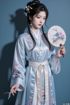 A gentle and lively Hanfu girl stands in front of a solid color background, showcasing classical beauty. Her face was clear and beautiful, with eyebrows like distant mountains, eyes filled with autumn water, a delicate nose bridge, elegant lips, fair and translucent skin, as if emitting a faint halo. Her long hair was like a waterfall, partially tied into exquisite buns, adorned with pearl hairpins and tassels. Her hair accessories swayed gently with her movements, adding a touch of agility. Her movements were elegant and natural, with her right hand lightly holding a fan embroidered with plum blossoms, her left hand slightly lifted, and her fingertips lightly stroking her temples, as if feeling the breeze. She was wearing a light blue Hanfu, with a cross collar and right lapel on the top. The fabric was light and soft, and the cuffs were embroidered with delicate orchid patterns. The hem of her lower body was wide and hanging, and the skirt was on the surface. Embroidered with landscape patterns, a light colored ribbon is tied around the waist, with the end of the ribbon hanging down and swaying gently in the wind. Light and shadow cast from the side, gently outlining the contours of her face and the layering of her clothing. The silk fabric shimmered with delicate luster under the light, creating an overall picture full of classical charm and elegant temperament,A BOW—Lijun,Bow—Chinese style dress,A BOW—daiyu
