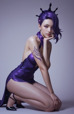 supermodel,score_8_up,score_7_up,hyperdetailed,hyperrealistic,volumetric lighting,focus on face,textured skin,eye lighting,SkinHairDetail,zPDXL,very attractive,Expressiveh,realistic skin,score_9,score_8_up,score_9,score_8_up,1 girls,high cold face,yujie,perfect round large,breasts,jewelry,beautiful eyes,detailed eyes,<lora:daofhspony:0.8>,bare shoulders,black footwear,breasts,full body,high heels,lips,looking at viewer,medium breasts,purple hair,tattoo,kneeling,head rest,purple dress,