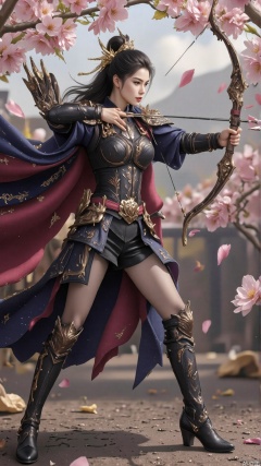 The female warrior of the Three Kingdoms is imposing, her armor adorned with mysterious runes. Her black stockings and embossed combat boots complement her heroic posture as she draws her bow with unwavering determination. The battlefield is filled with flying arrows, captured by a Nikon D850 with an aperture of f/5.6, shutter speed of 1/1000s, and ISO 100. The cool tone is enhanced with arrow trajectory effects, highlighting the tension and intensity of the battlefield.,plns_high heels,Cherry blossoms