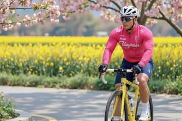 A male cyclist with a strong build, wheat-colored skin, deep and three-dimensional facial features, and determined and focused eyes. He is wearing a professional and close-fitting vibrant colors bikesuit with fluorescent brand logo lines on it. His body is leaning forward, his arms are swinging powerfully, and his legs are pedaling the pedals quickly. The background is Cherry blossoms,golden rapeseed field,a mountain road illuminated by the sun, with interlaced light and shadow. The artistic style is realistic, shot with a Canon 5D4 camera at an aperture of F4.