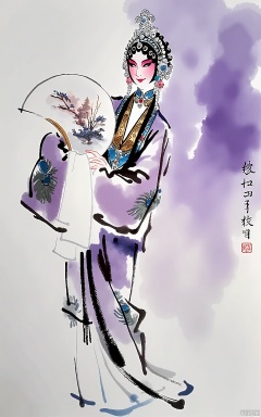 A watercolor in the Peking Opera style portrays a courtesan in an exquisite silk gown, embroidered with peacock feather patterns. Her expression is alluring, and she wears a headdress with pearls and jade ornaments. The background is a soft purple, creating an air of mystery. She holds a silk fan with a landscape painting on it in her right hand. The overall style is sensual and refined, characteristic of traditional Chinese art.
