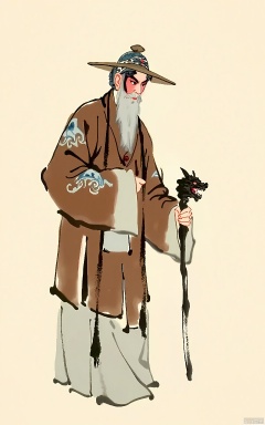 This Peking Opera - themed watercolor features an old sage in a long, brown robe with mountain and river patterns. His head is topped with a simple bamboo hat, and his expression is wise. The background is minimalist and beige, allowing the sage to stand out. He holds a walking stick with a carved dragon head in his left hand. The overall style is serene and profound, with a typical traditional Chinese art style.