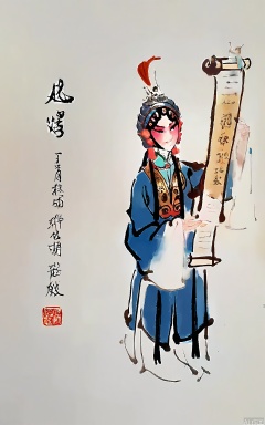 This Peking Opera - inspired watercolor features a scholar in a flowing blue robe, embroidered with cloud and crane patterns. He has a contemplative look on his face, and on his head sits a traditional scholar's cap with a tassel. The background is a plain light green, making the scholar the focal point. In his right hand, he holds a scroll of ancient texts. The painting style is elegant and refined, typical of traditional Chinese art forms.