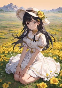 score_10,score_9,score_8_up,score_7_up,1girl,solo,long hair,black hair,field,flower,hair ornament,outdoors,white skirt,skirt,yellow flower,jewelry,hat,bracelet,dress,looking_at_viewer,eye-contact,