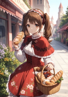 score_10,score_9,score_8_up,score_7_up,1girl,basket,bread,solo,food,brown hair,dress,twintails,brown eyes,blurry,blurry background,lolita fashion,baguette,long sleeves,looking at viewer,red dress,holding,holding basket,long hair,outdoors,capelet,floral print,hairband,red capelet,bow,frills,looking_at_viewer,eye-contact,