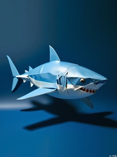 ZD, Photograph of a 3D paper shark sculpture, with a menacing blue and white color palette, swimming in a deep blue background. The shark has a streamlined, powerful design with sharp teeth and bold white accents. Its eyes are coldly detailed with a black pupil and a small white highlight. The sculpture is in a side view, displaying its sleek profile. The fins are spread wide, and the tail is moving rapidly. The lighting is dark and blue - toned, accentuating the sharp folds of the paper. The overall style is modern and minimalist, highlighting danger and speed.