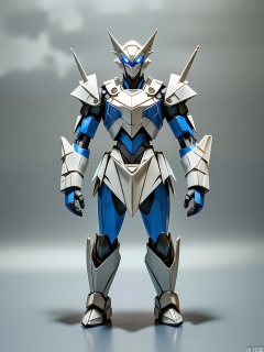 ZD, Photograph of a 3D paper robot sculpture, with a futuristic silver and blue color scheme, standing on a metallic gray background. The robot has a angular, mechanical design with sharp edges and bold blue lines. Its eyes are glowing with a blue light, detailed with a white outline. The sculpture is in a front view, showing its high - tech appearance. The arms are extended outwards, and the head is tilted to the side. The lighting is cold and sterile, highlighting the precise folds of the paper. The overall style is modern and minimalist, with a focus on innovation and technology.