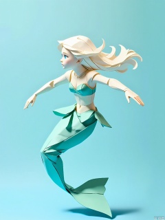 ZD, Photograph of a 3D paper mermaid sculpture, with a dreamy turquoise and white color palette, swimming in a light blue background. The mermaid has a graceful, fish - like tail and a human upper body with flowing white hair. Its eyes are enchantingly detailed with a blue iris and a white highlight. The sculpture is in a side view, displaying its elegant form. The arms are outstretched, and the tail is moving gracefully. The lighting is soft and underwater - like, emphasizing the fluid folds of the paper. The overall style is modern and minimalist, highlighting fantasy and beauty.
