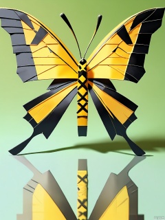 ZD, Photograph of a 3D paper butterfly sculpture, with a vibrant yellow and black color combination, fluttering against a light green background. The butterfly has a delicate, intricate design with fine lines and bold black patterns. Its eyes are minutely detailed with a tiny white dot surrounded by a black outline. The sculpture is in a top - down view, revealing its symmetrical wings. The antennae are curved upwards, and the body is slightly arched. The lighting is bright and focused, accentuating the precise folds of the paper. The overall style is modern and minimalist, emphasizing beauty and fragility.