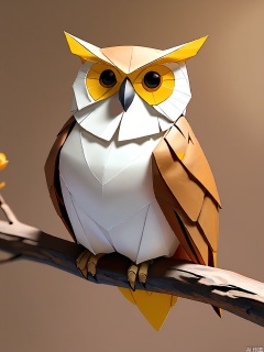 ZD, Photograph of a 3D paper owl sculpture, in a wise brown and white color scheme, perched on a tree branch against a dark brown background. The owl has a round, plump design with large eyes and soft white feathers. Its eyes are incredibly detailed with a yellow iris and a black pupil. The sculpture is in a front view, showing its intense gaze. The wings are folded close to the body, and the head is tilted slightly upwards. The lighting is dim and moody, emphasizing the gentle folds of the paper. The overall style is modern and minimalist, with a focus on wisdom and mystery.