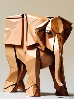 ZD, Photograph of a 3D paper elephant sculpture, featuring a warm gray and soft brown color palette, standing on a beige background. The elephant has a robust, rounded design with gentle slopes and bold brown patches. Its eyes are carefully crafted with a white sclera and dark brown pupils. The sculpture is in a three - quarter front view, displaying its massive form. The trunk is curved downwards, and the ears are flapping gently. The lighting is even and warm, highlighting the textured folds of the paper. The overall style is modern and minimalist, focusing on strength and serenity.