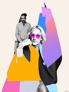 PTYS, Photograph of a man with a beard and short, wavy hair, wearing a black suit, a bright orange shirt, and pink sunglasses. He is seated and resting his head on his hand, looking directly at the camera. The background is a mix of abstract shapes and colors, including pink, blue, and yellow. The image is overlaid with a grayscale photo of the man, creating a layered effect. The overall aesthetic is playful and vibrant, with a modern, abstract art style.