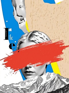 PTYS, Photograph of a mixed media collage, featuring a close-up of a person's face with braided hair, partially obscured by a large red brush stroke. The background includes a grayscale portrait of a woman, a blue section with a black "e" and the text "for him" in white, and a textured, distressed wall. The collage also includes a section of a mountain landscape with snow-capped peaks. The overall composition is eclectic and layered, with a mix of textures and colors.