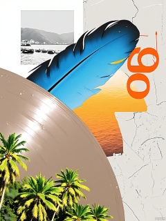 PTYS, Photograph of a mixed media collage, presenting a close - up of an old vinyl record with scratches, partially overlaid by a large blue feather. The background comprises a grayscale picture of a beach at sunset, an orange section with a red "o" and the text "forever" in white, and a cracked, stucco - textured wall. The collage also has a section of a tropical rainforest with lush green foliage. The overall composition is varied and layered, combining a range of textures and shades.