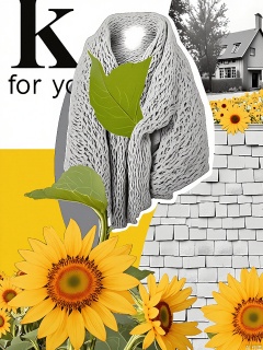 PTYS, Photograph of a mixed media collage, presenting a close - up of a hand - knitted scarf with intricate patterns, partially obscured by a large green leaf. The background includes a grayscale photograph of a country cottage, a yellow section with a black "k" and the text "for you" in white, and a textured, wooden - shingle wall. The collage also has a section of a sunflower field with bright yellow blooms. The overall arrangement is eclectic and rich in layers, combining different textures and colors.